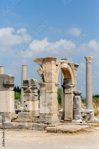 Fototapeta premium Perge, or Perga is ancient Anatolian city in Pamphylia. Colonnade and ruined Demetrios Apollonios arch. Vertical shot. Antalya region, Turkey (Turkiye). Travel and ancient history concept