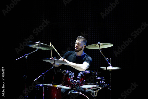 © nagaets, Fototapeta premium Perkusista sylwetka na scenie. Ciemne tło, reflektory dymne
