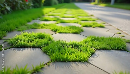 © BeeSee, Fototapeta premium Permeable concrete pavers with green grass growing between honeycomb-shaped tiles created with generative ai
