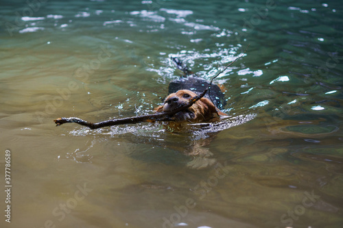 © Tony Moguer, Obraz premium Perro beagle nadando en un lago durante una ruta de naturaleza trae un palo