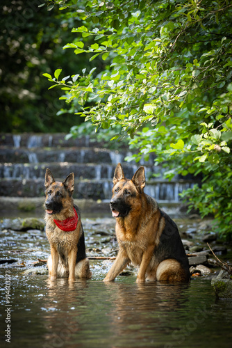 © anettastar, Naklejka premium Perro pastor alemán de pura raza salta y juega en el río con cascadas, papel tapiz colorido, fondo para tu diseño