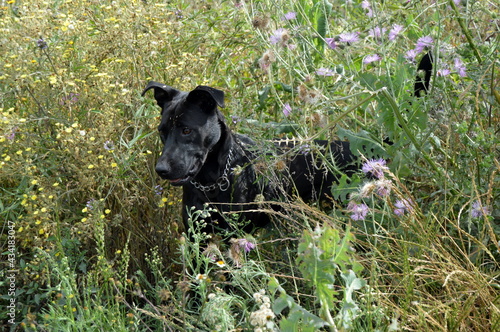 © Estefania, Fototapeta premium Perros negros en campo de primavera