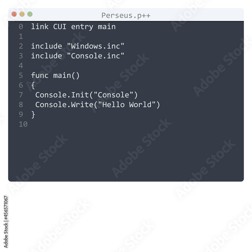 Fototapeta premium Perseus language Hello World program sample in editor window