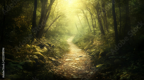 Obraz premium Perseverance Through Nature's Obstacles: Overcoming Challenges on a Winding Forest Path