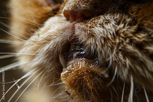 © Oskar Reschke, Obraz premium Persian cat's mouth, captured in high-definition detail, revealing a row of broken and decayed teeth. Drops of saliva hang from its gums, giving the impression of a creature on the brink of death.