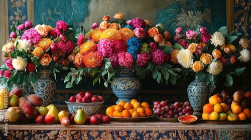 © Aisha, Fototapeta premium Persian new year celebration with vibrant flowers and fruits arranged on a decorative table