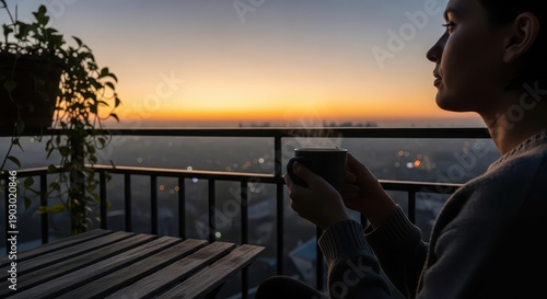© Ariestia, Fototapeta premium Person enjoys steaming beverage while observing a city panorama during twilight hours from an elevated balcony.