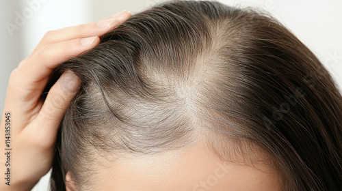 © Xinfang, Obraz premium Person examining thinning hair in mirror, reflecting on aging and self-care. Embracing natural changes and prioritizing health and well-being.