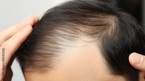 © 曦 王, Obraz premium Person examining thinning hair in mirror, reflecting on aging and self-care. Embracing natural changes and prioritizing health and well-being.