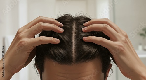© Grosir, Naklejka premium Person Gently Touching Dark Brown Hair Examining Scalp Health in a Blurred Bathroom Setting for Hair Care and Dermatological Illustration