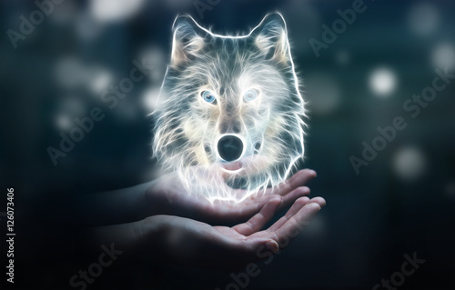 © sdecoret, Naklejka premium Person holding fractal endangered wolf illustration 3D rendering