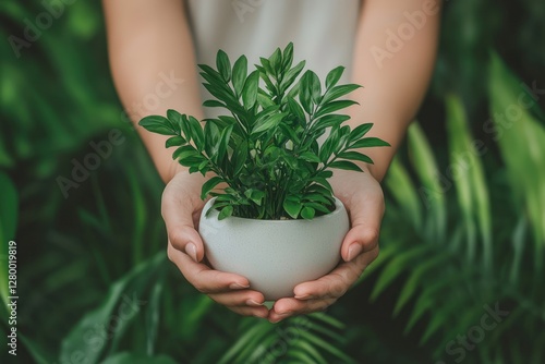 © Thanyaporn, Fototapeta premium Person Holding Green Plant in White Pot Surrounded by Foliage