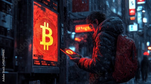 Fototapeta premium Person in a Rainy City Holding a Tablet While Interacting with a Bitcoin Display in Neon Red Illuminated Streets