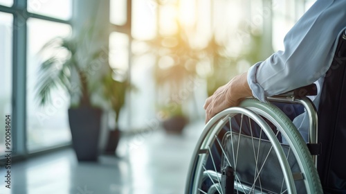 Fototapeta premium Person in a wheelchair in a modern office environment with plants....