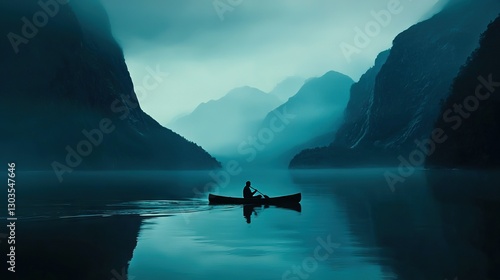 © Anna, Fototapeta premium Person in boat on lake amidst mountains and foggy air