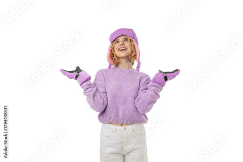 Fototapeta premium Person in pink sweater enjoys winter fun, isolated, PNG