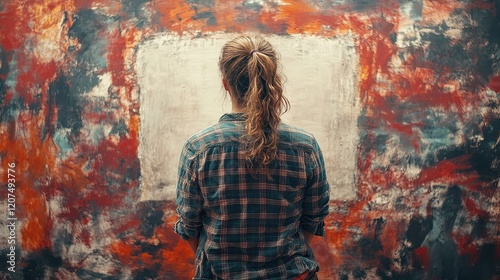 © Namwan, Obraz premium Person in Quiet Studio Standing Before Blank Canvas Background