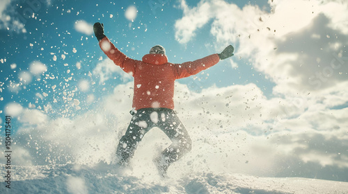 © EFA, Naklejka premium Person in Red Jacket Joyfully Jumping in Snowy Landscape
