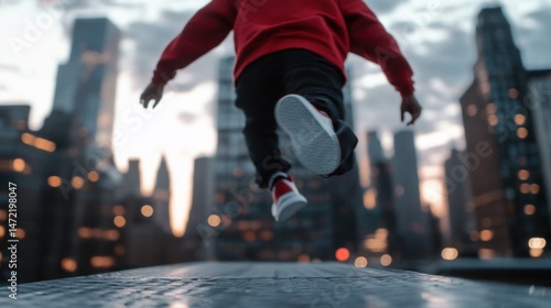 © Generative AI, Fototapeta premium Person in red sweatshirt leaps over urban cityscape at sunset, showcasing dynamic movement and city lights in the background. : Generative AI