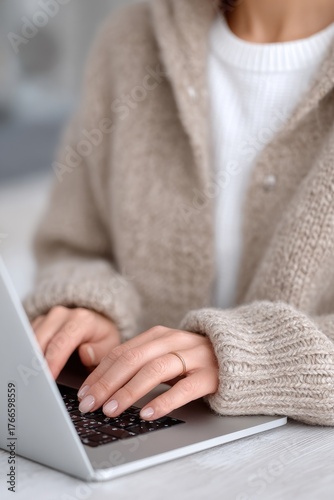 Naklejka premium Person in warm beige knit sweater typing on laptop, soft natural light and...