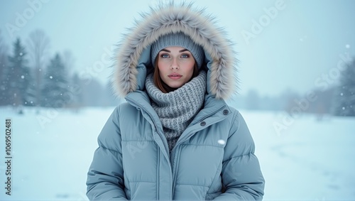 Obraz premium Person in winter clothing with obscured face, standing in a snowy landscape,...