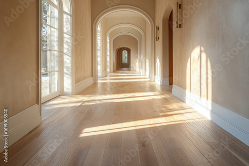 © kristina, Fototapeta premium Person jogging in a long hallway by a large window on a wooden floor.