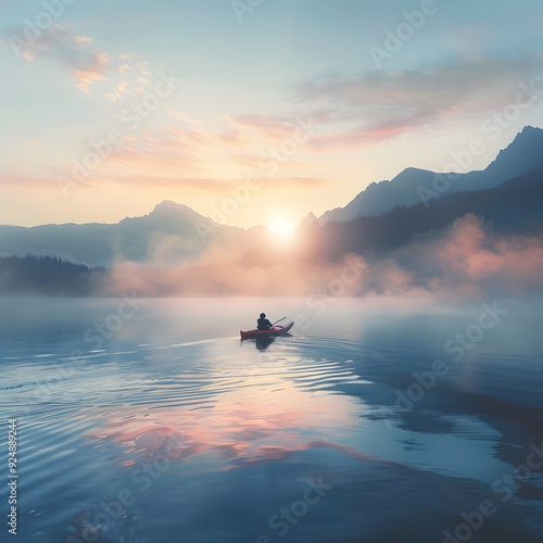 © SkyRebeL, Fototapeta premium Person kayaking on calm lake at sunrise with mist and mountains
