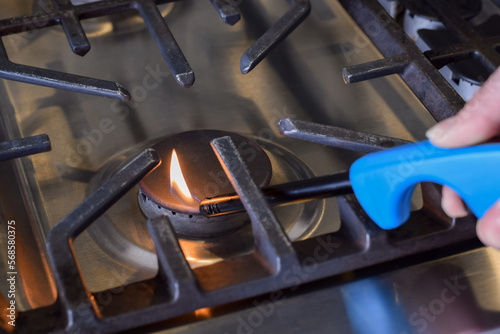 Fototapeta premium Person lighting gas stove with wand lighter