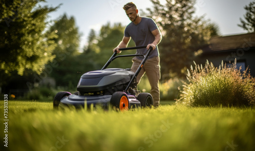 © olegganko, Fototapeta premium person mowing grass with an orange lawn mower