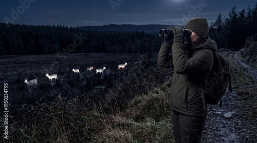 Fototapeta premium Person observing deer in wilderness using advanced night vision binoculars