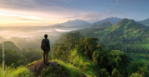 © Bahtiar, Naklejka premium Person on hilltop, vast valley, sunrise