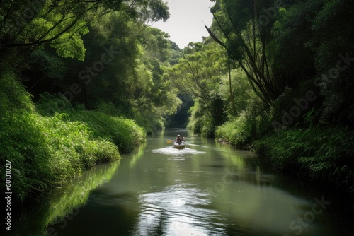 Fototapeta premium person paddling their canoe down tranquil stream, surrounded by greenery, created with generative ai