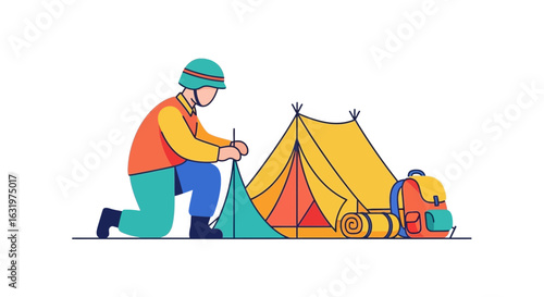 © Yanto, Fototapeta premium Person pitching tent with backpack and sleeping mat for camping adventure