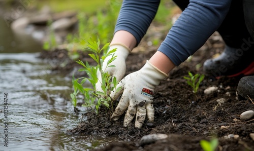 Fototapeta premium Person planting a sapling by a stream.