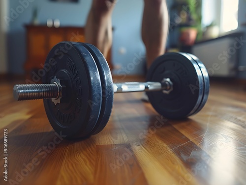 © pavlofox, Naklejka premium Person preparing to lift a dumbbell in a well-lit home gym on a wooden floor during afternoon workout session