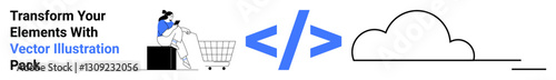 © robu_s, Obraz premium Person pushing a shopping cart, coding symbols, and a cloud icon convey digital transformation. Ideal for technology, e-commerce, cloud computing, web development, innovation, coding flat landing