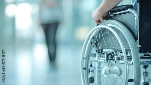 © Namwan, Fototapeta premium Person pushing a wheelchair, blurred background in a bright, spacious environment, theme of assistance and mobility.