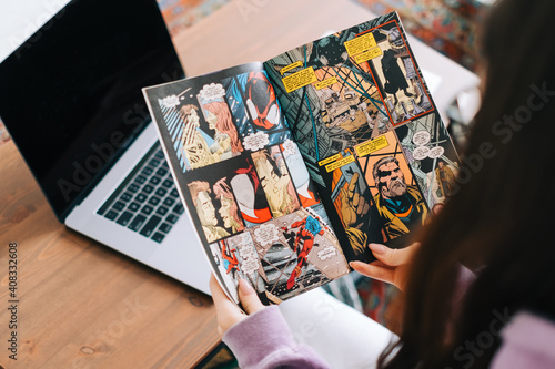 © nikkimeel, Naklejka premium Person reading comic book at home in living room. Rostov-on-Don, Russia. 25 January 2021