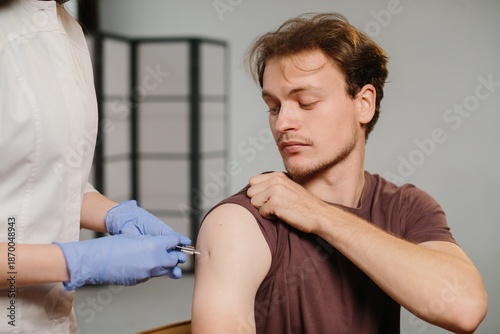 © dsheremeta, Fototapeta premium Person receiving vaccination looking serious at clinic