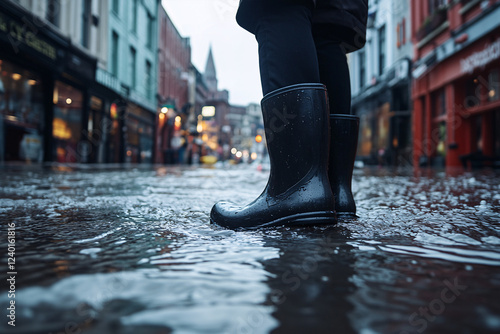 © Firn, Obraz premium Person's feet in rubber boots standing in flood water in city street