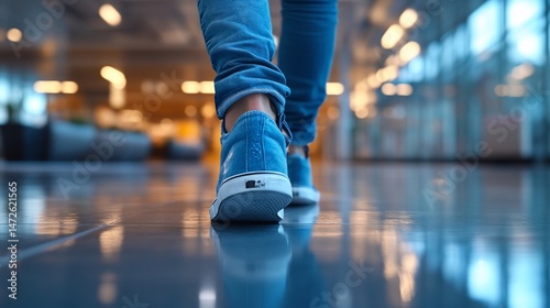 Fototapeta premium Person's legs and shoes in motion along a gleaming floor in a blurred background