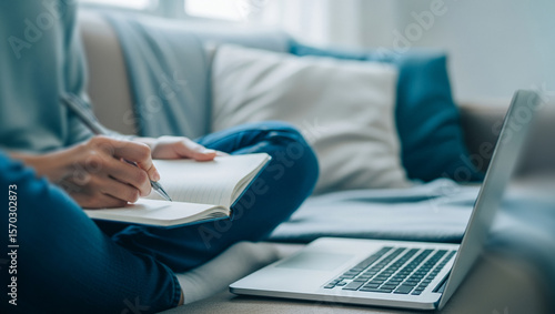 © Renderis, Naklejka premium Person sitting on couch writing in notebook with laptop in foreground.