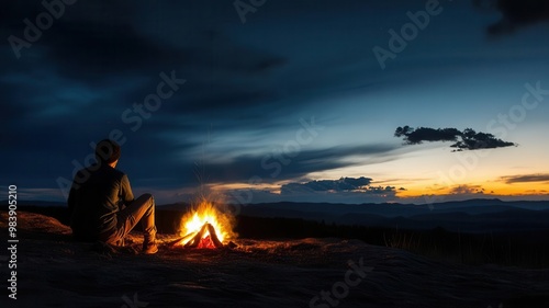 Obraz premium Person sitting peacefully by campfire, solo retreat, serene wilderness...