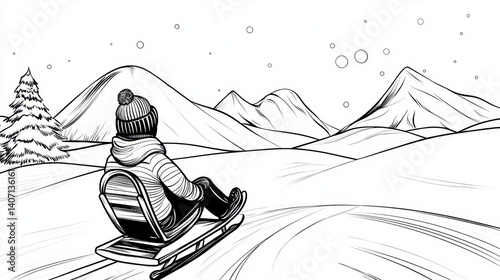 © Yaowarat, Naklejka premium Person Sledding in Winter Landscape