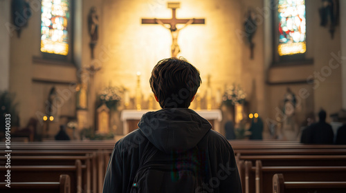 Naklejka premium person standing in church, reflecting in serene atmosphere