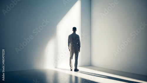 Obraz premium person standing in front of wall. Minimalistic background with man and shadow...