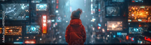 © kramynina, Obraz premium Person standing in the rain looking at a city