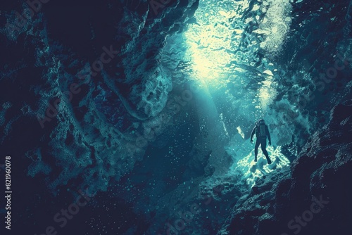 © Fotograf, Fototapeta premium Person standing on a surfboard in a cave. Suitable for adventure sports concept