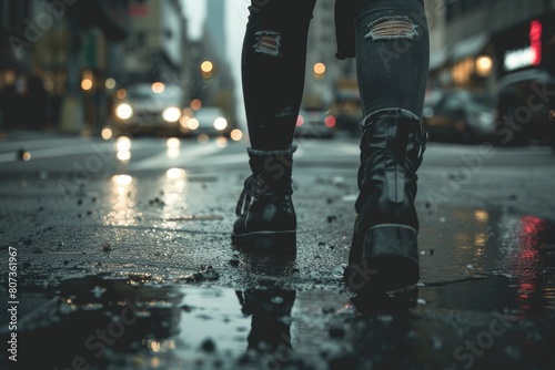 Fototapeta premium Person standing on wet sidewalk in the rain, suitable for weather concept designs