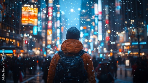 © siyons, Fototapeta premium Person Stands Alone In Snowy City Night